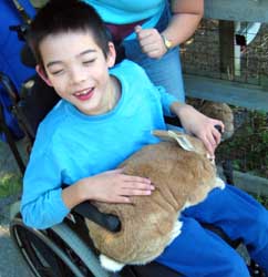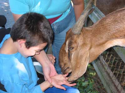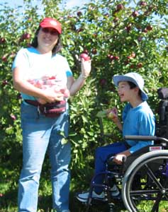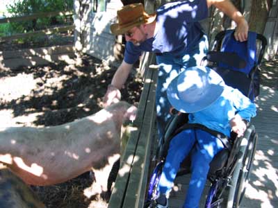 We coaxed an anxious Jon onto the wheelchair-accessible “hayride” (the wagon had a ramp and one space with chair tie-downs—”just like my schoolbus!”—among the hay bales). Of course, as soon as it started to move a big grin split his face, and he thoroughly enjoyed the rest of the ride.