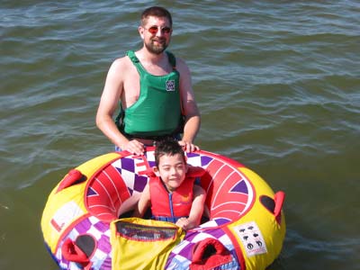 We went for two runs (Jon on my lap), both of which he enjoyed and both of which ended in wipeouts. The first one was spectacular…we windowshaded so quickly I simply found myself four or five feet under, instinctively hoisting Jon to the surface (no need of course, since we were wearing our PFDs, but instinct does take over). After the second wipeout, he actually surfaced laughing, and now he pretty much thinks that you end a good tubing run by going for an exciting dunk!