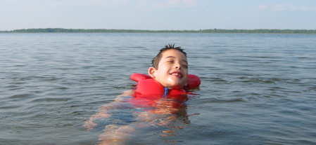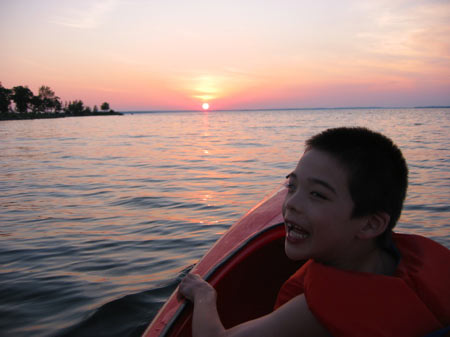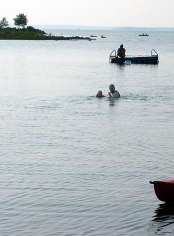 Jon pushed the envelope in his swimming prowess; we needed to find a place to jump in, given that this year it’s far too shallow off of Grandpa’s dock. He and I kayaked to a communal raft anchored in the centre of our little bay, because IMHO it was too far for him to swim. Well, after we had our jumping jollies on the raft, Jon insisted on swimming back to land alone (in his PFD, and me nearby, of course), but when he got to shore he turned right around and went back to the raft, where we played some more, and then he swam home again.
