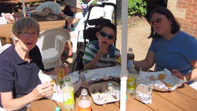 At Centreville we saw a woman selling mylar balloons, nice ones, mainly of licensed characters: SpongeBob, Dora, Mr. Incredible, Marlin and Nemo, etc. She informed us that the small ones were $6 and the large ones were $10. Highway robbery we sniffed to ourselves; when Jon indicated that he would like a balloon we got him a small one (Elmo from Sesame Street) as we couldn’t bring ourselves to buy an expensive one.