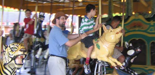 First ride ever, the antique merry-go-round. Waiting to start was hard, but we got the idea.